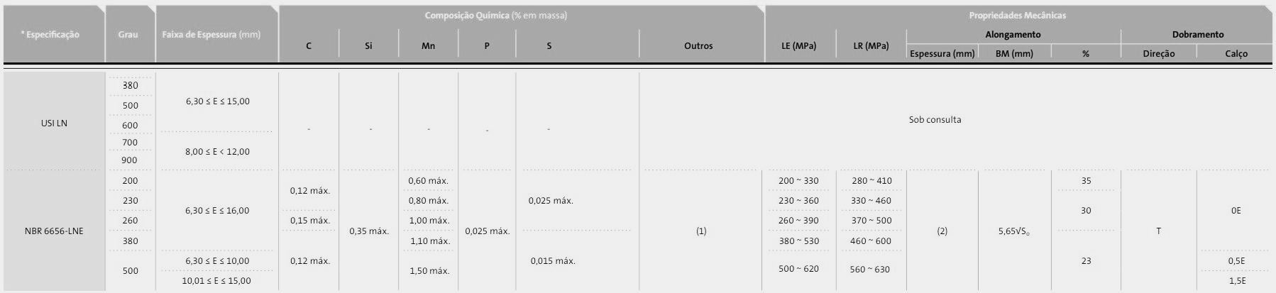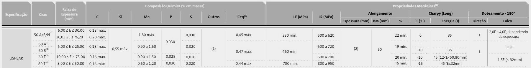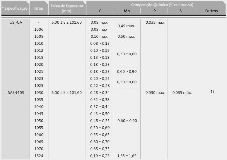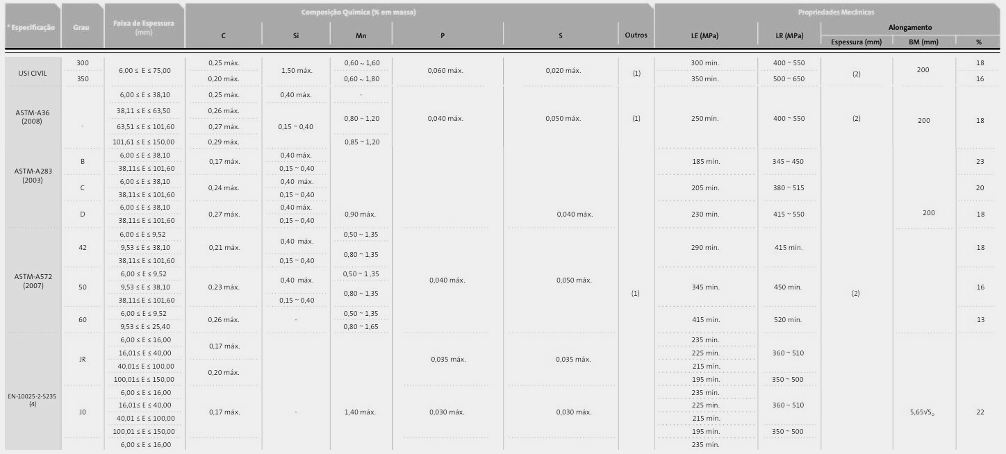 Qualidades: A-36, comercial, NTU-QC250T, 1045, A-572gr50, A-516gr60, A-516gr70, Usi-sac-350, Usi-sac-300, Usi-sar-80T, Usi-ar-400, Usi-ar-450, En-S355 entre outras.