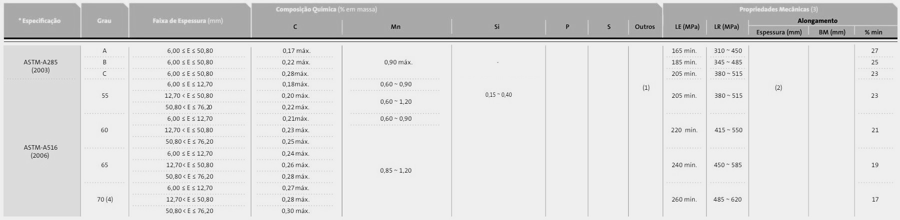 Destinados à fabricação de caldeiras e vasos de pressão, se enquadram conforme a faixa de resistência mecânica e as condições de temperatura e pressão de trabalho, sendo especificados pela norma ASTM e as respectivas correspondentes ASME e EN 10028. A principal característica desses aços é a sua versatilidade de desempenho quanto à temperatura de uso de -60°C até 500°C. Como requisitos suplementares podem ser garantidos, mediante consulta, ensaio de impacto a baixa temperatura (-40°C ou inferior), tração a alta temperatura (300°C ou superior), dobramento e outros mais específicos.
